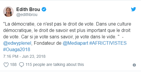Personnalité assez connue des réseaux sociaux africains, notamment des réseaux professionnels, pour sa veille sur les problématiques numériques, et particulièrement marketing, le profil d’Edith Brou ne correspond pas à celui d’une activiste en ligne. Néanmoins, le succès de certains de ses tweets ainsi que sa place centrale dans la cartographie démontrent que ce genre de profils éditorialisés de manière marginale par rapport au sujet du forum peuvent rencontrer un certain succès pour autant qu’ils ne relaient pas de messages techniques, mais plutôt des messages inspirationnels dans lesquels les déclarations bienveillantes et généralistes d’Edwy Plenel se rangent sans peine.