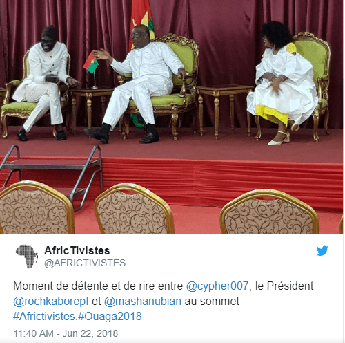 Cette communauté s’organise autour de l’Africtiviste Aisha Dabo (@mashanubian), qui occupe la place principale, à travers sa couverture personnelle de l’événement et les nombreux relais qu’elle a suscité via ses propres tweets, mais également par un nombre de mentions importantes lorsqu’elle était sur scène. Sur cette dernière partie, c’est notamment son “fou rire” avec @cypher007 et le Président burkinabé @rochkaborepf qui prime :