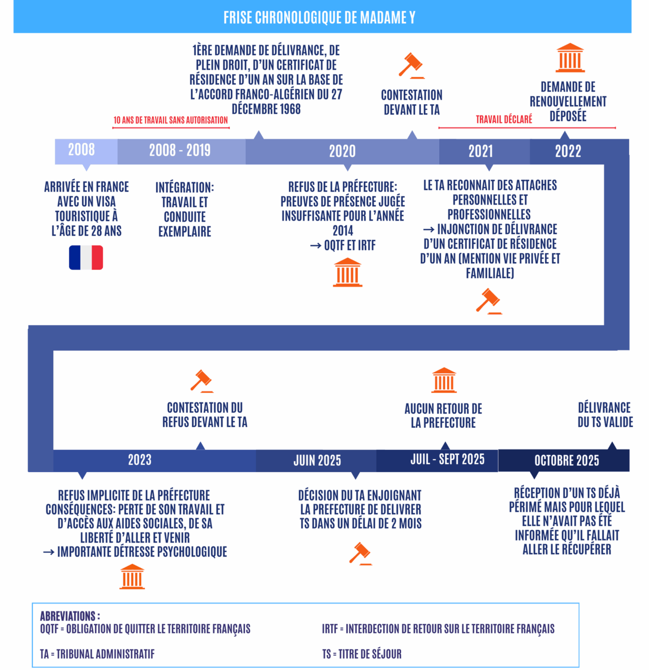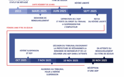 La frise ci-dessous est un cas anonymisé instruit par la Permanence Juridique de France Fraternités. Elle retrace le parcours, mouvementé, d’une de nos bénéficiaires : 18 ans de galères. Chaque mois, nous publierons un cas qui illustre les dysfonctionnements de l’ANEF et l’impact dramatique qu’ils ont sur le parcours des étrangers en France.
